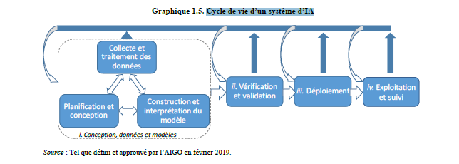 Les schémas et situations de développement présentés ci-dessous visent à fournir des éléments que l'on espère le plus lisibles et compréhensibles possibles pour prendre la mesure du caractère itératif des projets d'application d'IA, des différentes étapes qui le constituent, des parties prenantes internes et externes à l'organisation qui y sont associés, des spécificités des briques technologiques mobilisées. La représentation des étapes s'est délibérément inspirée des pratiques DevOps , privilégiées dans de nombreux projets de SIA.